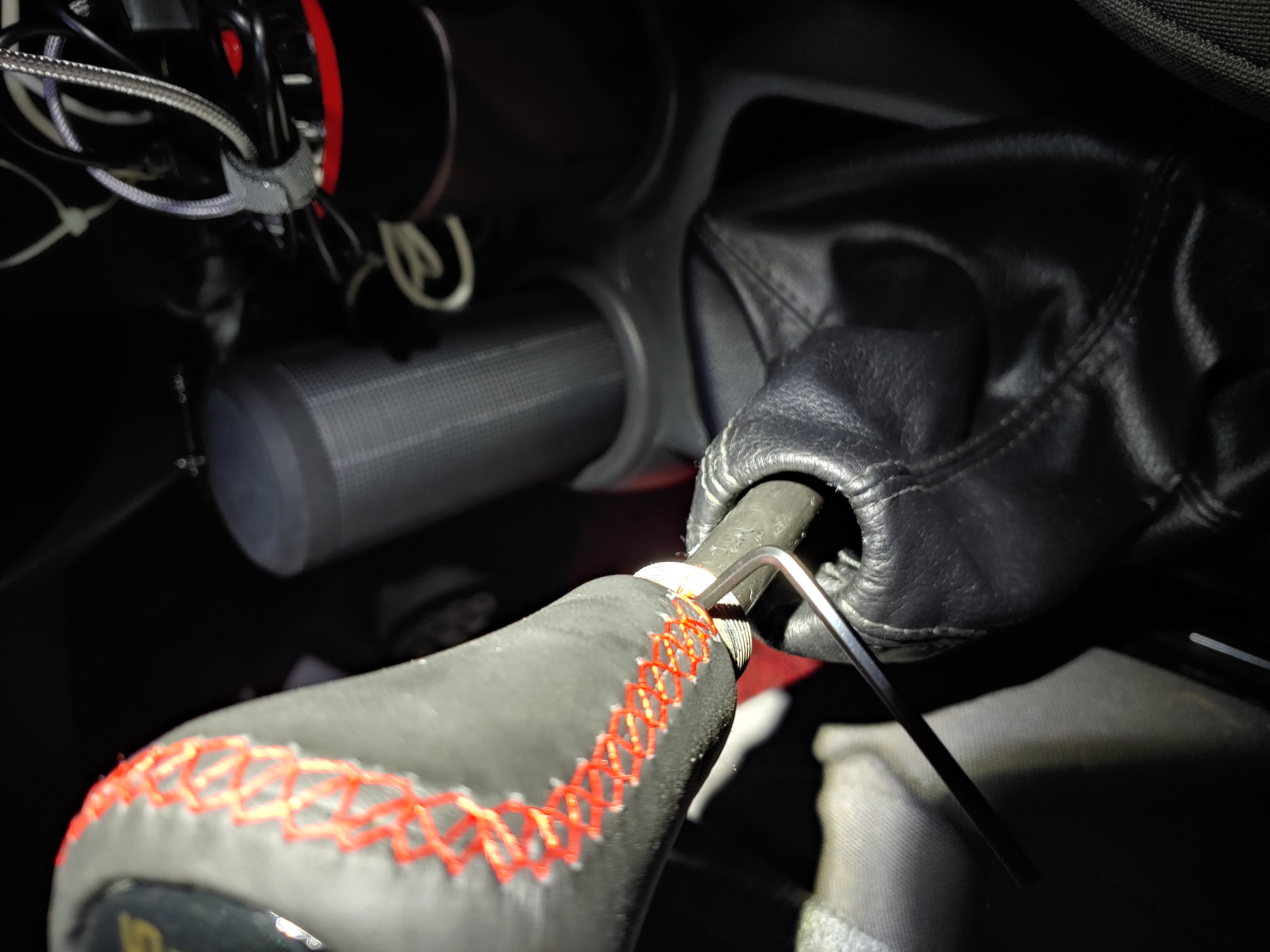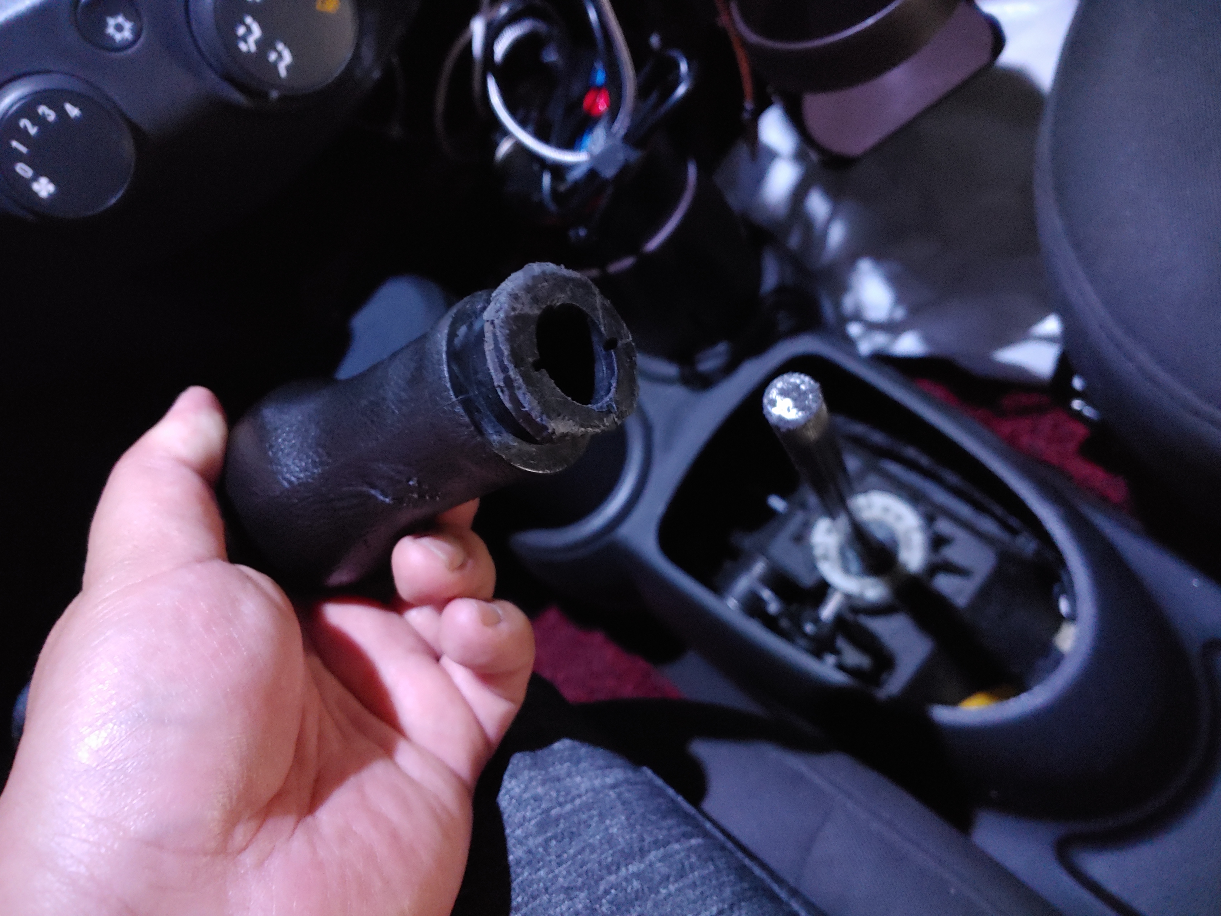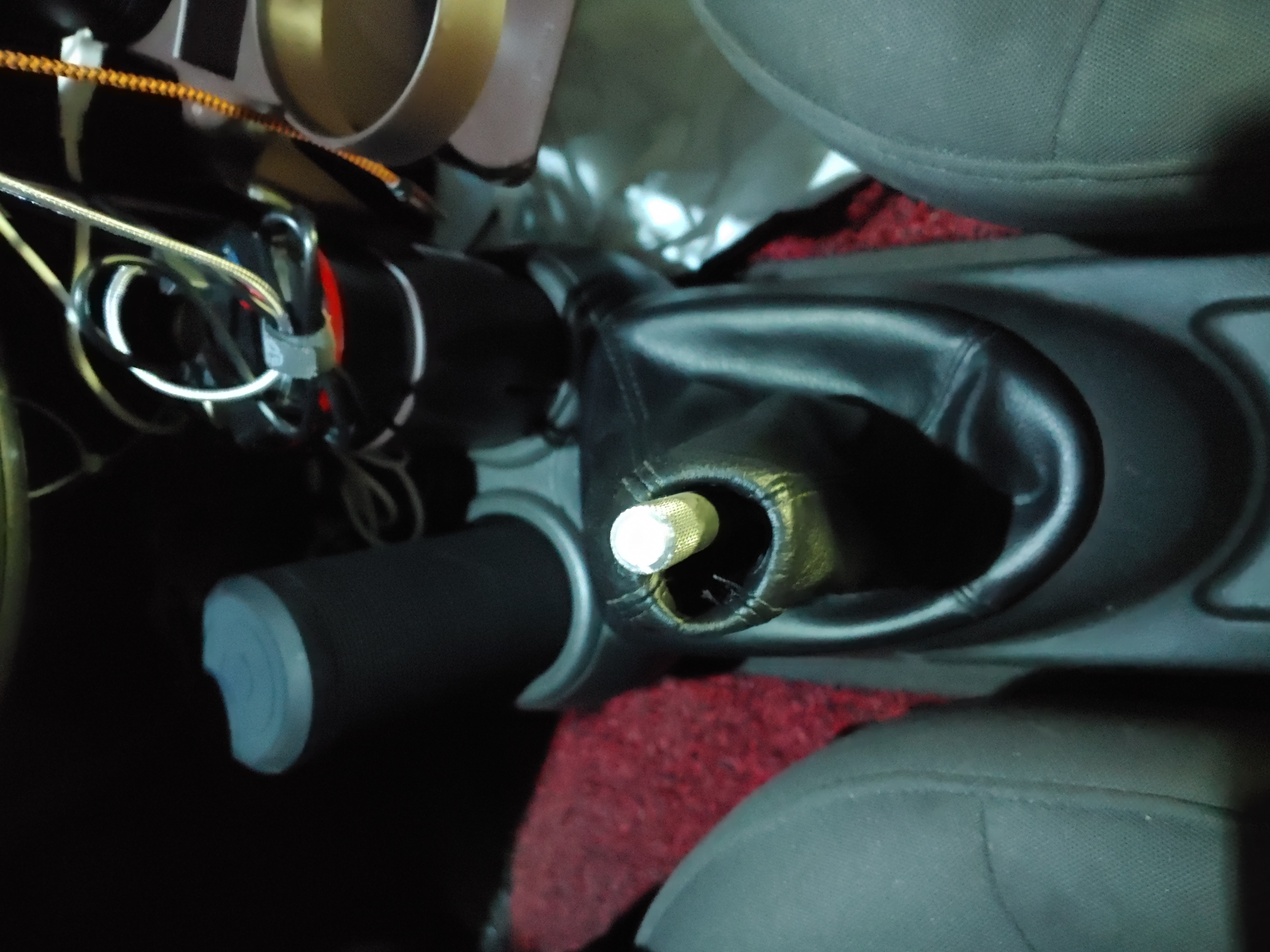 기어 노브 안쪽에 케이블 타이로 묶여있습니다. 이 부분을 잘라내서 기어 커버를 완전히 벗겨 냅니다