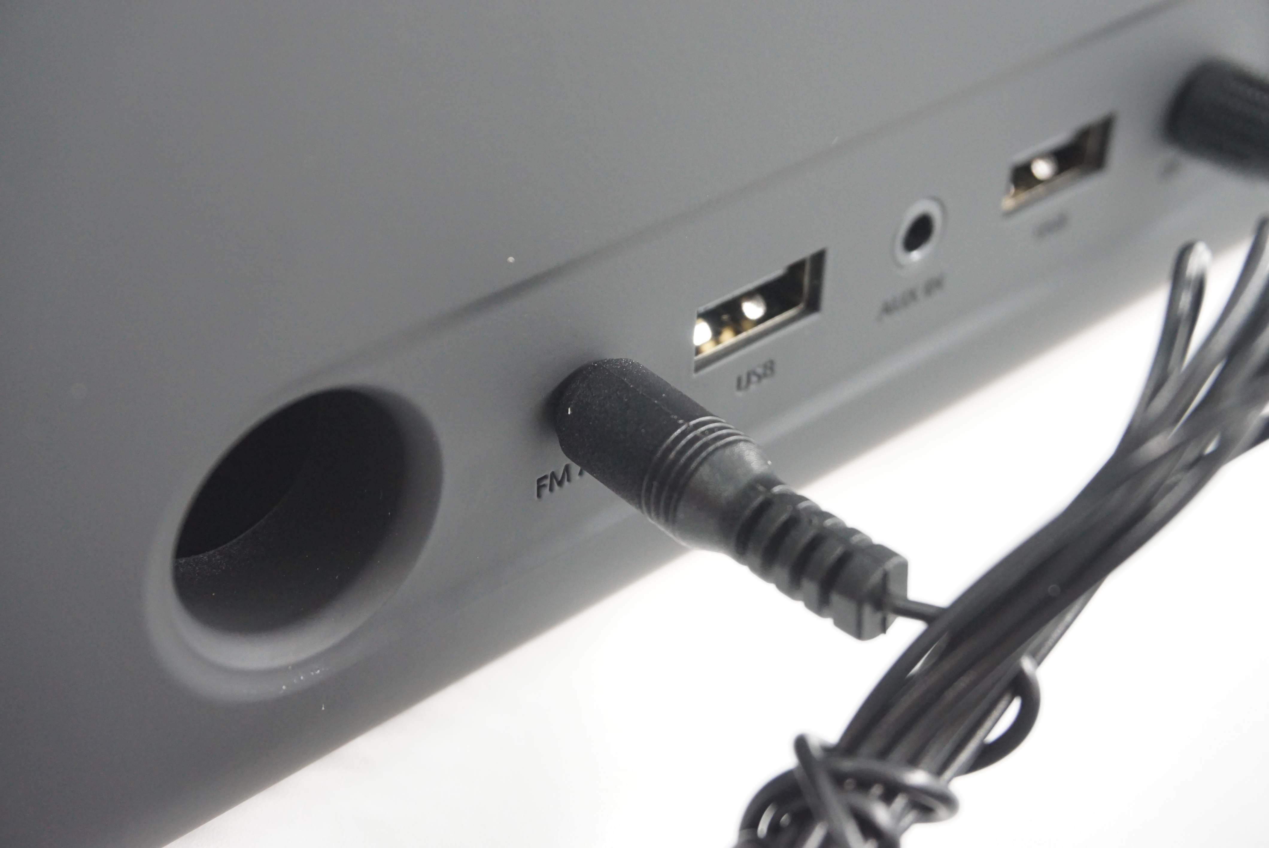 후면입니다. FM안테나 단자와 2개의 USB단자가 있고 AUX 지원합니다. 배터리는 지원하지 않고 전원을 연결해야 합니다.