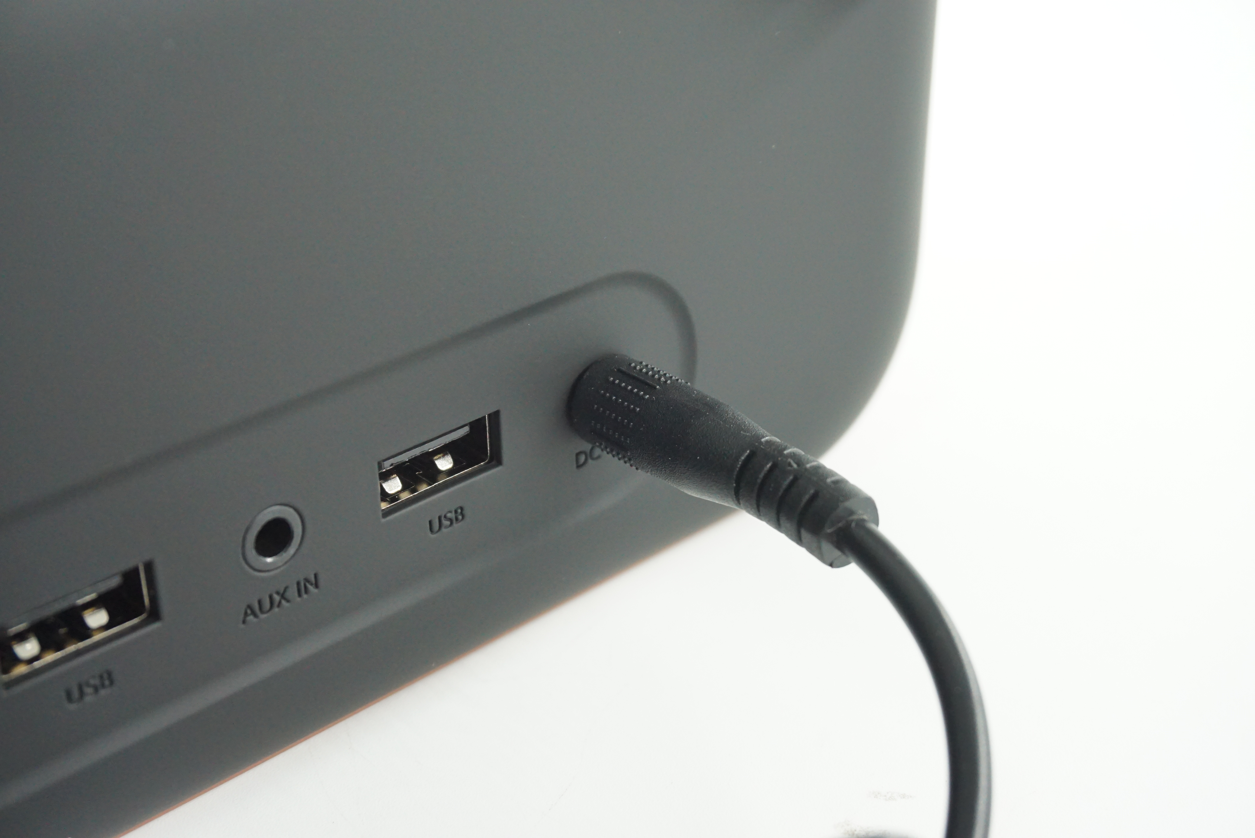 후면입니다. FM안테나 단자와 2개의 USB단자가 있고 AUX 지원합니다. 배터리는 지원하지 않고 전원을 연결해야 합니다.